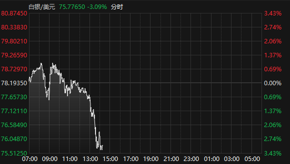 上证报中国证券网讯据Choice数据,1月8日,国际现货白银午后跳水,截至14:16报75.78美元/盎司,日内跌幅扩大至3%。
