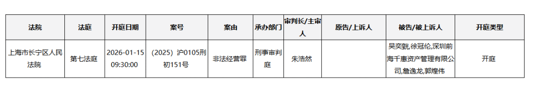 近日,上海长宁法院一则开庭公告引起金融圈关注,被告人是深圳前海千惠资产有限公司(简称“千惠资产”)及相关成员,案由是非法经营罪,将于1月15日开庭审理。