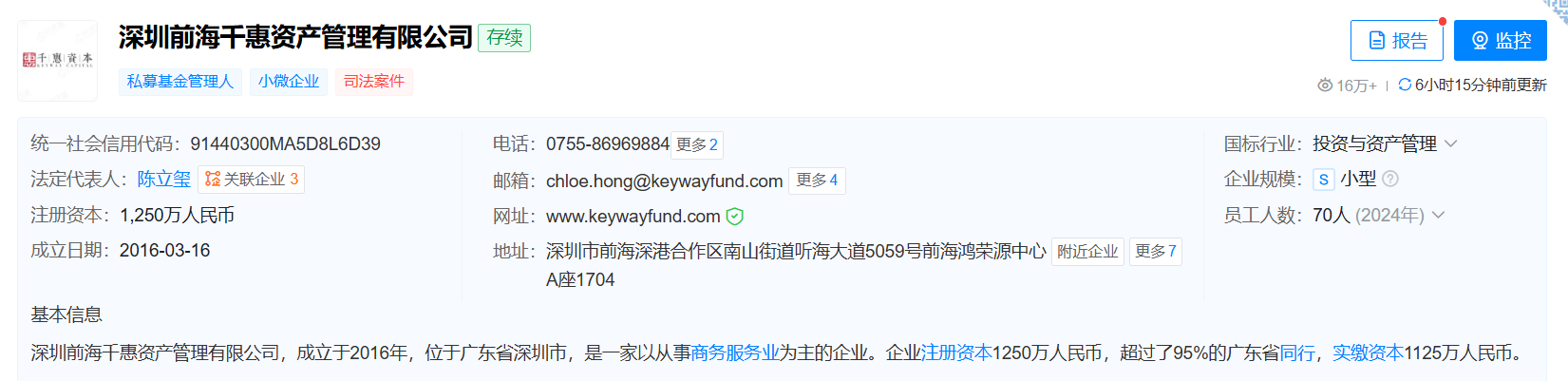 资料显示,千惠资本成立于2016年3月,并于2017年6月登记备案。公司注册资本1250万元,实缴比例90%。其规模常年保持在50亿元—100亿元。