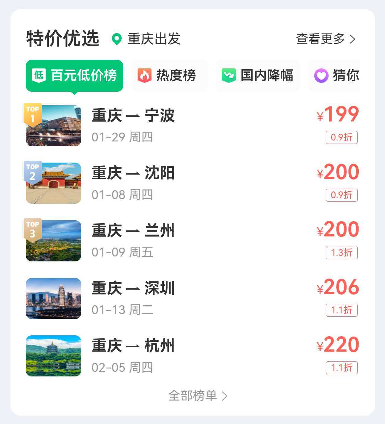 重庆出发的航班价格更为惊人,飞往宁波199元(0.9折)、沈阳200元(0.9折),兰州200元(1.3折),飞往深圳、杭州机票也只有206元、220元,仅相当于票面价的1.1折。