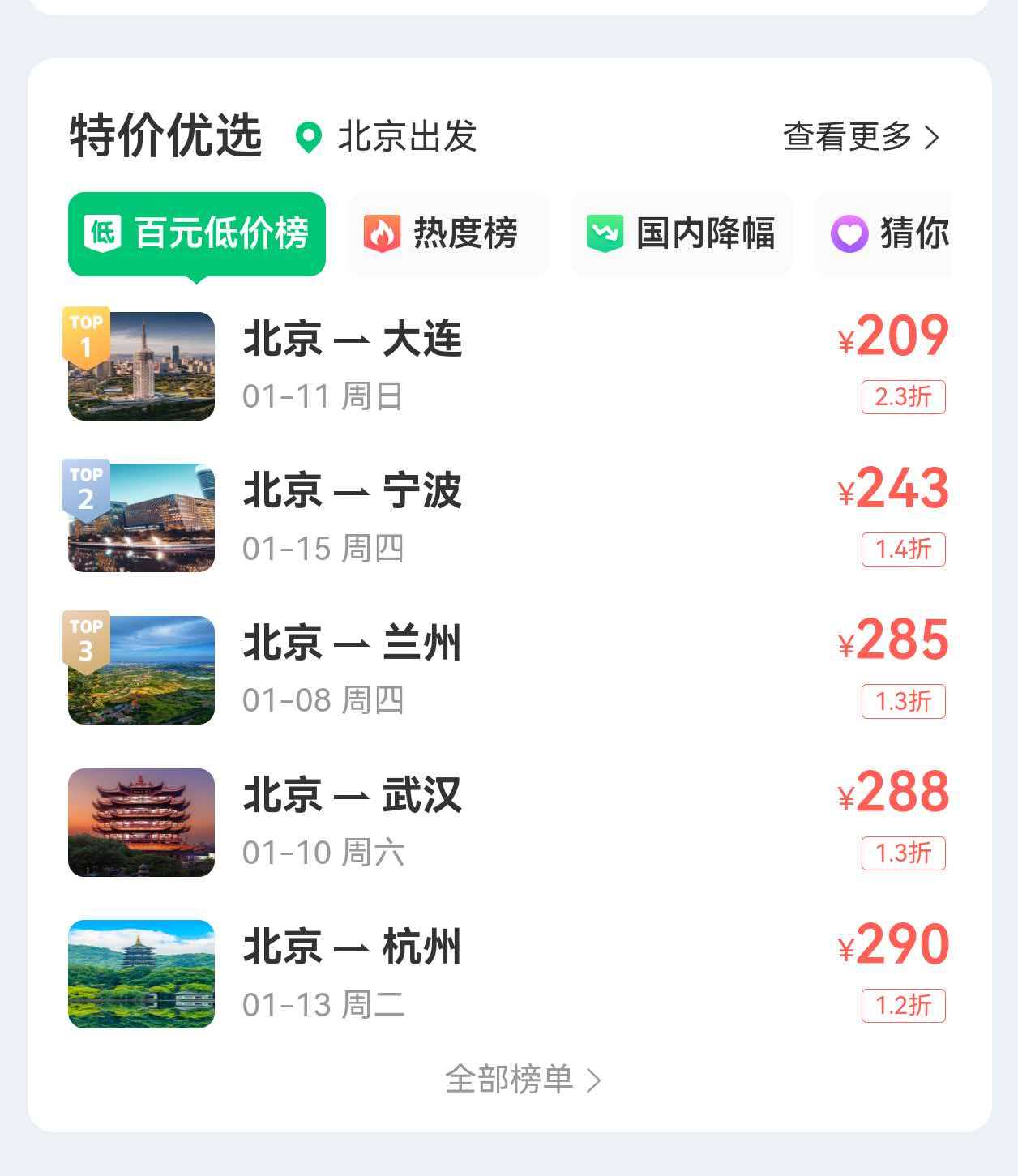 北京出发的机票价格略高一点点,但也有大量200出头的机票,比如北京飞鞍山、长治、大连、吕梁等地,票价只有210元,飞宁波243元,飞兰州285元,飞杭州290元。折扣率也在1.3折以下。