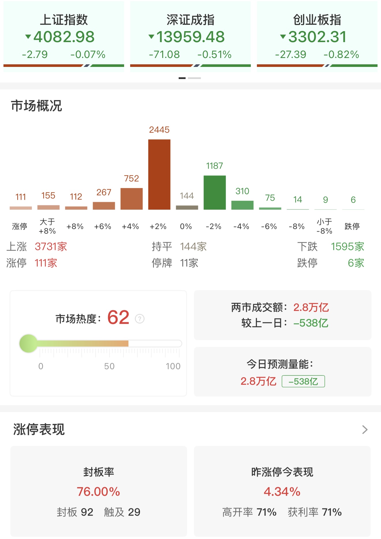 收评:创业板指震荡调整跌0.82% 全市场超百股涨停