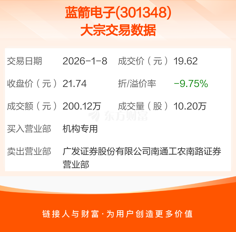 大宗交易:蓝箭电子成交200.12万元,折价9.75%(1-8)
