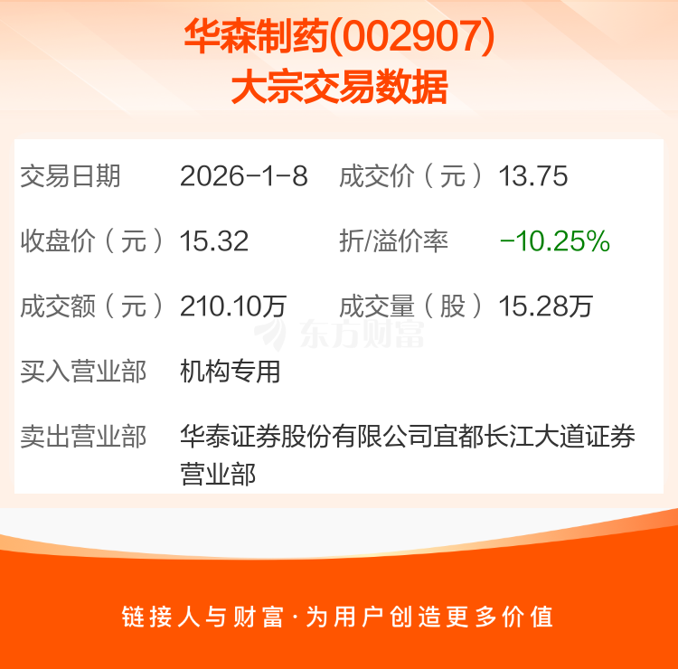 2026年1月8日,华森制药发生1笔大宗交易,共成交15.28万股,成交金额210.10万元,占其流通市值比例为0.05%。