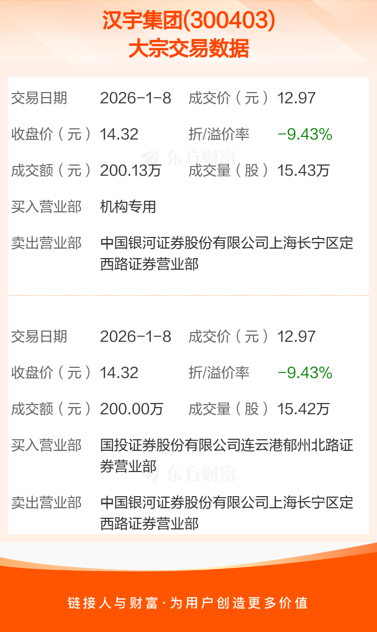 大宗交易:汉宇集团成交400.13万元,折价9.43%(1-8)