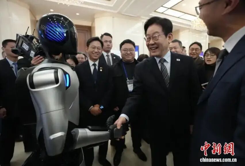 期间,李在明与中国机器人握手。这款机器人是智元机器人远征A2,它用中韩双语与李在明交流,并欢迎李在明访问北京和上海。随后李在明主动伸手,机器人回答“这可让我受宠若惊呢”引发现场欢笑。