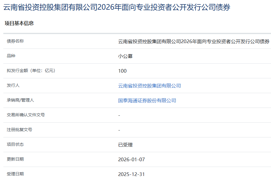 1月8日消息,云南省投资控股集团有限公司2026年面向专业投资者公开发行公司债券项目获上交所受理。