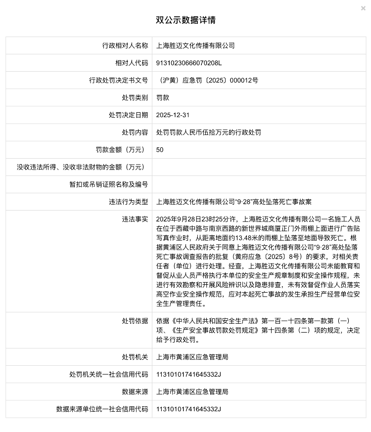 近日,上海市黄浦区应急管理局对上海胜迈文化传播有限公司作出行政处罚决定,因其安全生产管理责任落实不到位导致发生高处坠落死亡事故,依法对该公司处以50万元罚款。