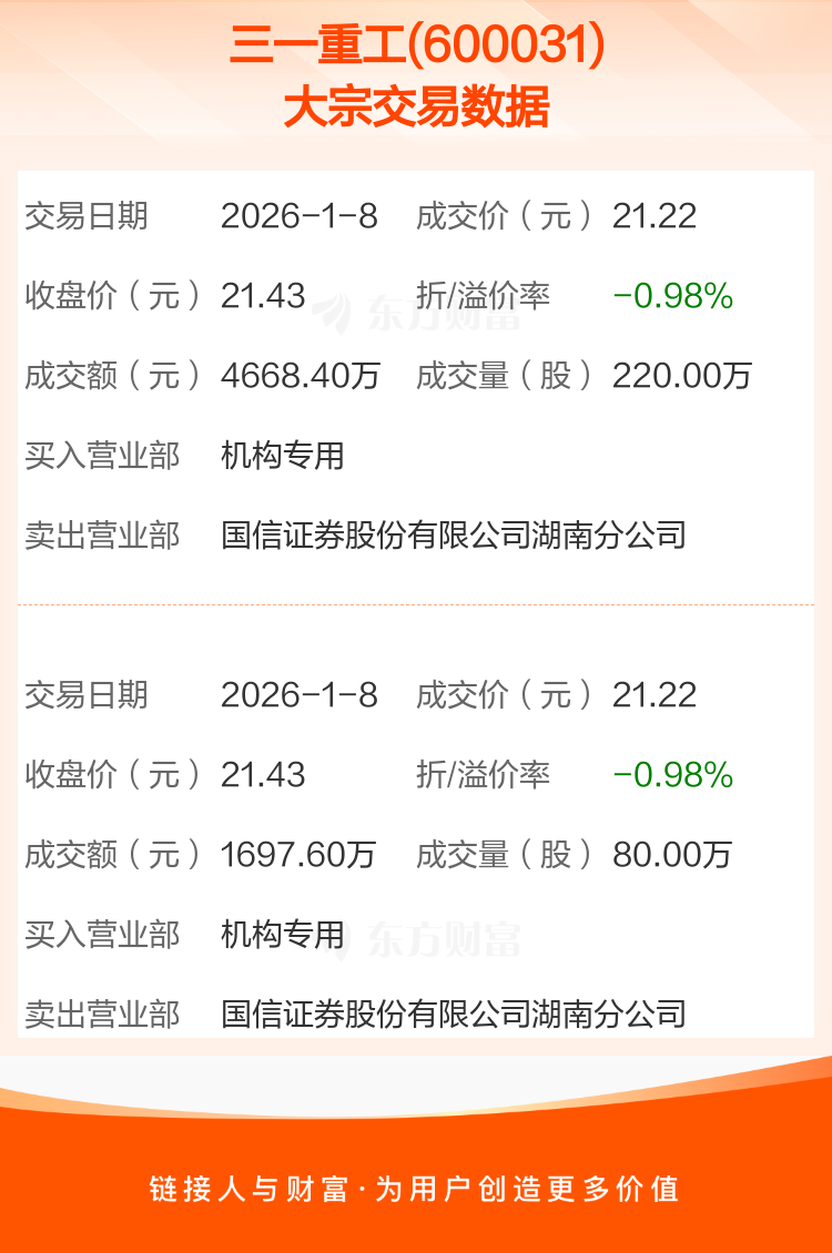 2026年1月8日,三一重工发生2笔大宗交易,共成交300.00万股,成交金额6366.00万元,占其流通市值比例为0.04%。