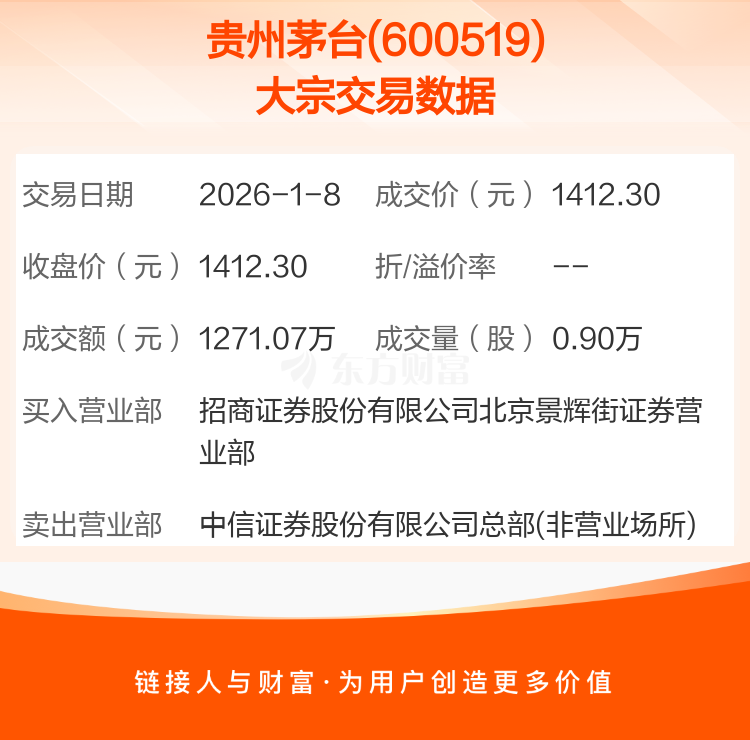 2026年1月8日,贵州茅台发生1笔大宗交易,共成交9000股,成交金额1271.07万元。