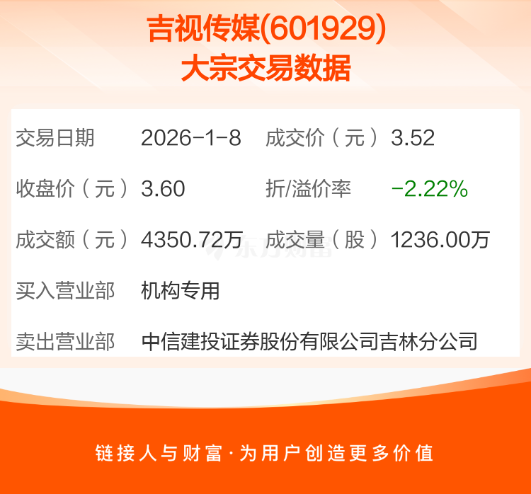 2026年1月8日,吉视传媒发生1笔大宗交易,共成交1236.00万股,成交金额4350.72万元,占其流通市值比例为0.35%。