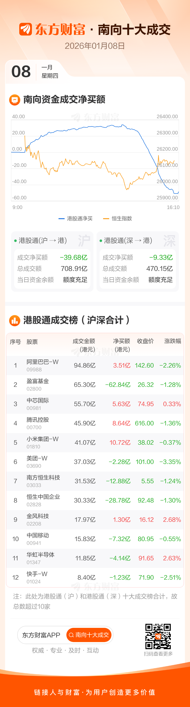 1月8日南向资金净卖逾49亿港元,逾10亿抢筹小米集团-W