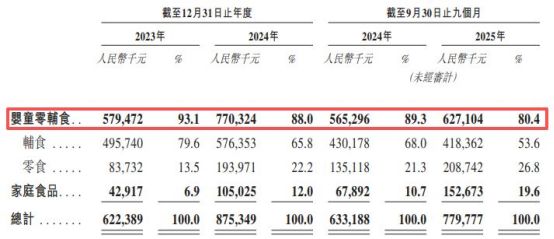 爷爷的农场提供婴童零辅食领域的食用油、调味品、果汁、果泥和果泥酸奶等产品及零食,还提供家庭食品领域的液态奶产品、方便食品、大米产品、调味品及食用油。不过,按产品类别划分,2023年、2024年和2025年前三季度(下称报告期内),爷爷的农场主要收入来自婴童零辅食,收入占比分别为93.1%、88%和80.4%。