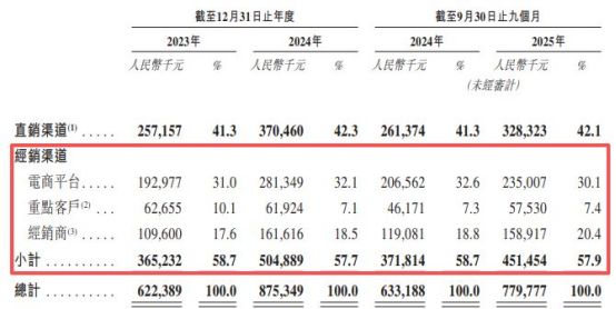 从渠道端来看,经销商渠道是爷爷的农场收入增长重要驱动力,报告期内,公司经销渠道的收入占比分别为58.7%、57.7%和57.9%。