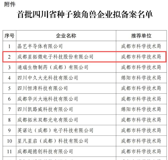 星拓微电子在技术创新与企业成长方面已获得多项认可。公司先后获评国家级专精特新“小巨人”企业,并于2025年成功入选四川省首批“种子独角兽”企业名单,显示出较强的技术实力与发展潜力。