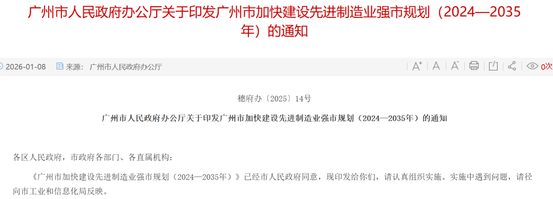 1月8日,广州市人民政府办公厅发布《广州市加快建设先进制造业强市规划(2024—2035年)》。