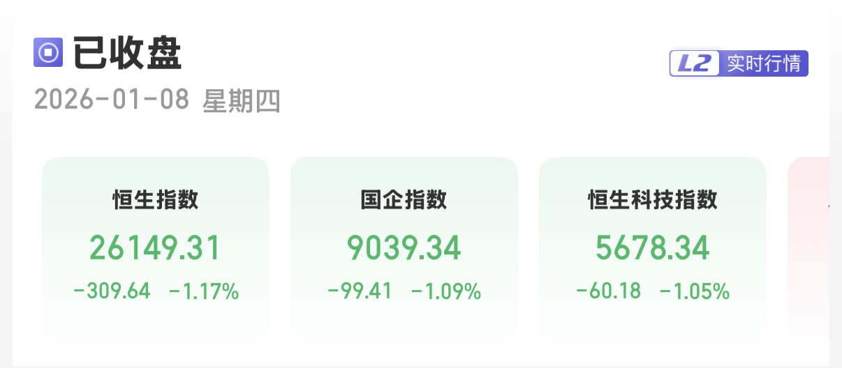 上证报中国证券网讯1月8日,港股三大指数集体下跌。截至收盘,恒生指数跌1.17%,报26149.31点;恒生国企指数跌1.09%,报9039.34点;恒生科技指数跌1.05%,报5678.34点。