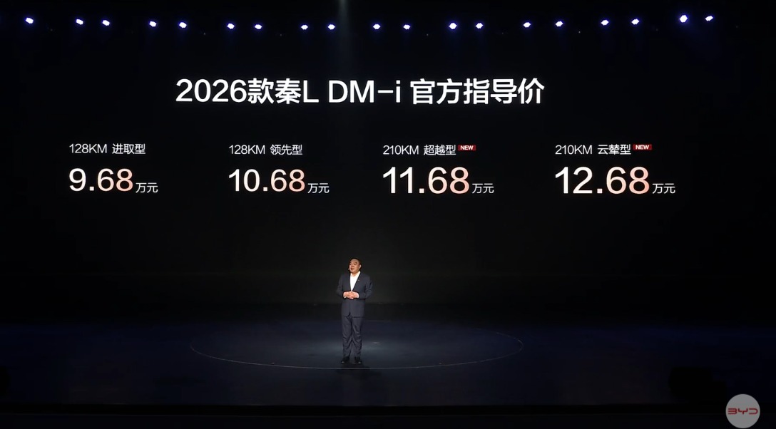 其中,2026款秦L DM-i 128KM 进取型起售价9.68万元,128KM领先型10.68万元,210KM 超越型起售价11.68万元,纯电续航里程为210公里。作为对比,2025款比亚迪秦L DM-i 120公里起售价为11.98万元。