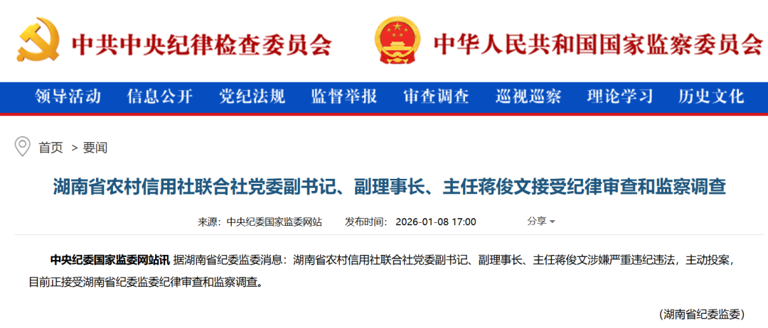 1月8日,中央纪委国家监委官网通报:湖南省农村信用社联合社党委副书记、副理事长、主任蒋俊文涉嫌严重违纪违法,主动投案,目前正接受湖南省纪委监委纪律审查和监察调查。