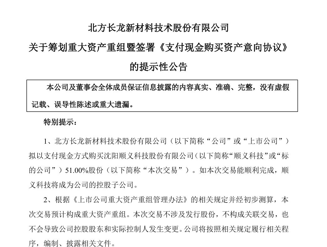 1月8日,北方长龙(301357.SZ,股价147.83元,市值140.73亿元)公告称,公司拟以支付现金方式购买沈阳顺义科技股份有限公司51.00%的股份,如交易顺利完成,顺义科技将成为公司的控股子公司。本次交易预计构成重大资产重组,不涉及发行股份,不构成关联交易,也不会导致公司控股股东和实际控制人发生变更。