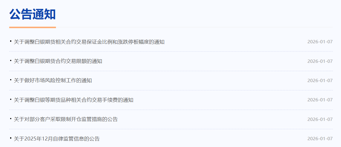 手续费方面,经研究决定,自2026年1月9日交易(即1月8日晚夜盘)起,白银期货AG2604合约日内平今仓交易手续费调整为成交金额的万分之二点五;锡期货SN2602合约日内平今仓交易手续费调整为15元/手。