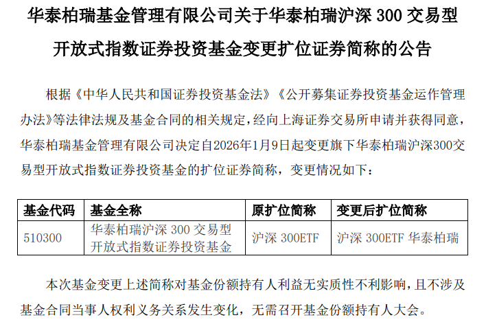 1月7日,华泰柏瑞基金发布公告,旗下沪深300ETF的场内扩位简称调整为“沪深300ETF华泰柏瑞”,该变更将于2026年1月9日起生效。
