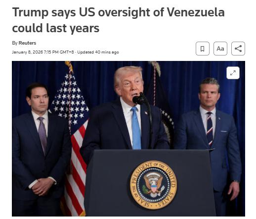 中新网1月8日电据路透社当地时间8日报道,美国总统特朗普表示,“美国可能在未来数年内对委内瑞拉实施监管并控制其石油收入。”