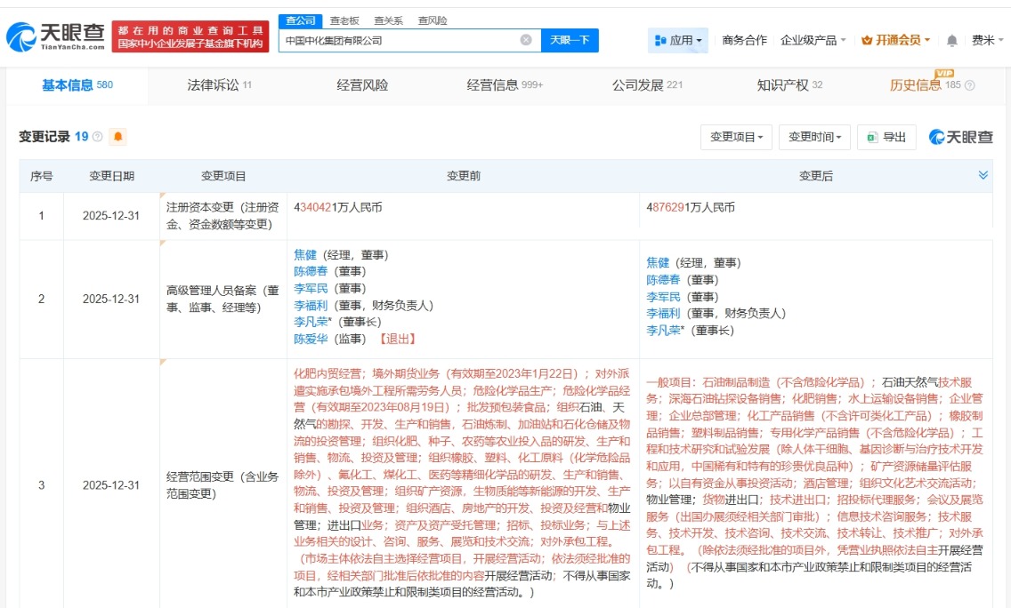 南方财经1月8日电,天眼查工商信息显示,近日,中国中化集团有限公司发生工商变更,注册资本由约434亿人民币增至约487.6亿人民币,增幅约12%,同时,部分主要人员发生变更。中国中化集团有限公司成立于1981年8月,法定代表人为李凡荣,经营范围包括石油天然气技术服务、深海石油钻探设备销售、化肥销售等。股东信息显示,该公司由中国中化控股有限责任公司全资持股。