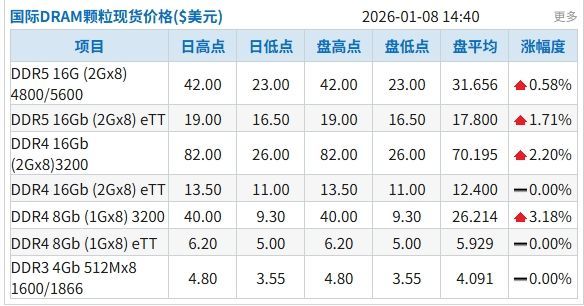 南方财经1月8日电,据集邦数据,今日国际DRAM颗粒现货价格涨幅多集中在DDR4。具体来看,DDR4 8Gb (512Mx16) 3200上涨3.58%,均价21.389美元,DDR4 8Gb (512Mx16) 2666上涨3.3%,均价15.667美元。