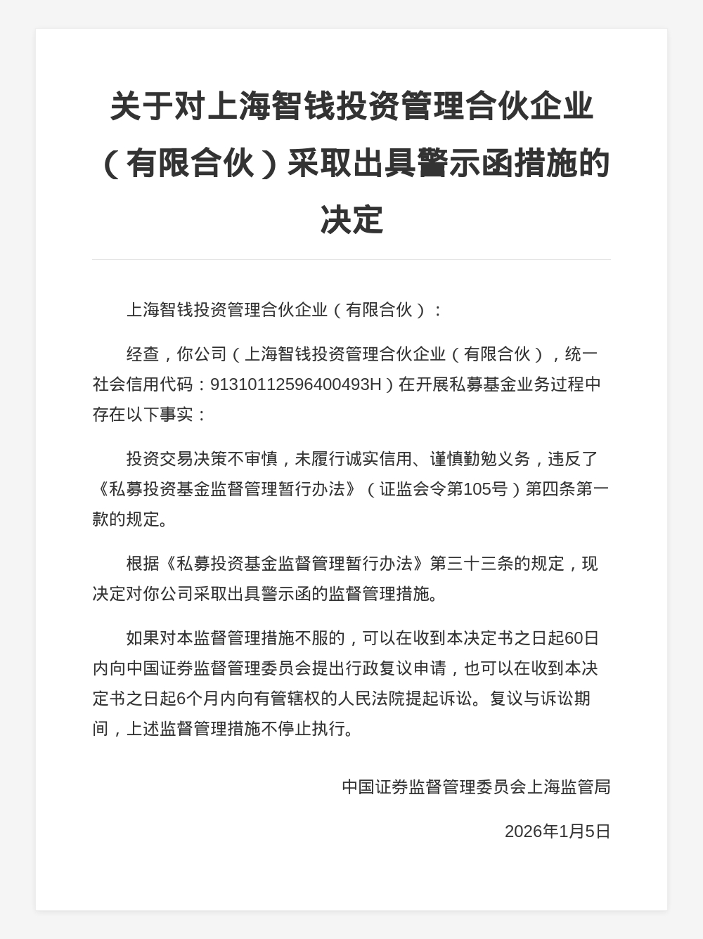上海智钱投资被出具警示函,涉投资交易决策不审慎等