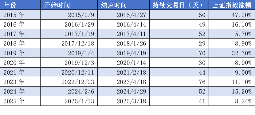 值得注意的是,春季行情的启动时间正在不断提前。数据显示,2020年以前A 股春季行情大多在春节后(2-3月)启动,平均持续时间约1-2个月;但2021年以来,这一规律被打破——近5年中有3年的春季行情提前至前一年12月启动,“年末抢跑”成为新的市场特征。