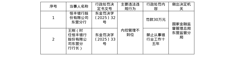 罚单显示,恒丰银行股份有限公司东营分行的主要违法违规事实(案由)为:内控管理不到位。