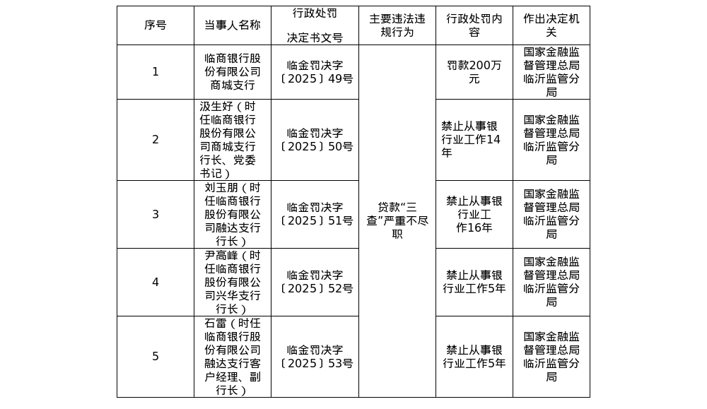 此外,汲生好(时任临商银行股份有限公司商城支行行长、党委书记)被禁止从事银行业工作14年;刘玉朋(时任临商银行股份有限公司融达支行行长)被禁止从事银行业工作16年;尹高峰(时任临商银行股份有限公司兴华支行行长)被禁止从事银行业工作5年;石雷(时任临商银行股份有限公司融达支行客户经理、副行长)被禁止从事银行业工作5年。