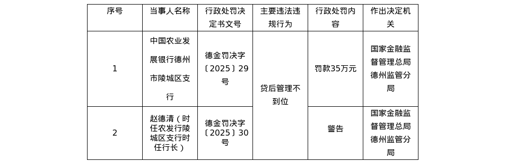 针对上述违法违规行为,国家金融监督管理总局德州监管分局对该支行罚款35万元;对时任中国农业发展银行德州市陵城区支行行长的赵德清,给予警告。