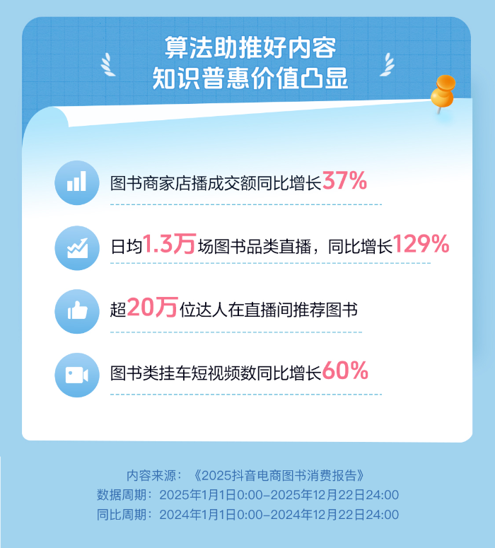 算法赋能更多小众、冷门图书持续出圈。过去一年,北京大学出版社《艺术:让人成为人》、电子工业出版社《基础化学与生活》等细分领域书籍在抖音吸引众多用户选购。同时,图书类优质内容持续涌现,数据显示,平台图书品类直播场次增长129%,20多万名达人在直播间推荐图书,图书商家店播成交额同比增长37%。