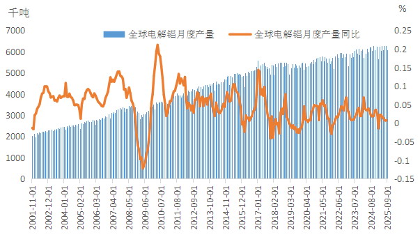 2025年1—11月,我国电解铝累计产量为4014万吨,同比增长1.85%。受产能天花板限制,国内电解铝产量增量有限。海外市场方面,国际铝业协会(IAI)数据显示,2025年1—10月全球电解铝产量为6140万吨,较2024年同期增长1.18%;扣除我国同期3650万吨产量后,海外电解铝产量为2490万吨,同比仅增长0.17%。