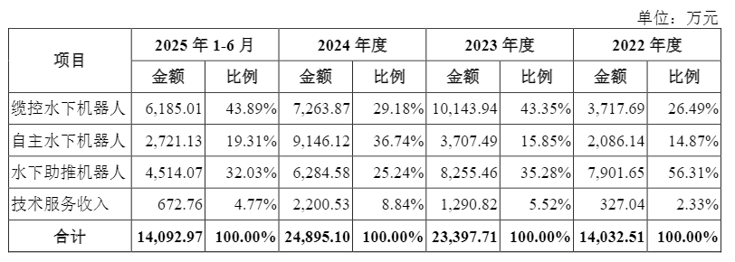 深之蓝在招股书中描绘了一幅营收稳步增长的图景:2022年至2024年,公司营业收入分别为1.41亿元、2.35亿元和2.51亿元,近三年复合增长率达33.23%;2025年上半年营收达1.41亿元,已追平2022年全年营收规模。