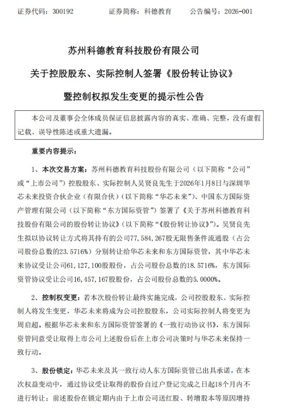 1月8日晚间,科德教育(300192)发布公告,公司控股股东、实际控制人吴贤良与深圳华芯未来投资合伙企业(有限合伙)(简称“华芯未来”)及中国东方国际资产管理有限公司(简称“东方国际资管”)签署《股份转让协议》,公司控制权将发生变更。