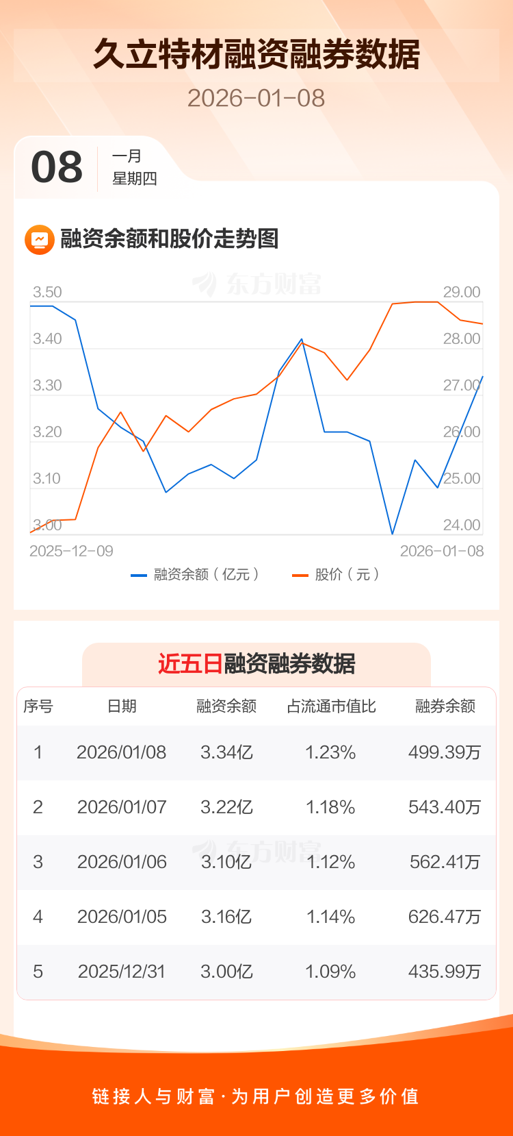 交易所最新数据显示,久立特材于2026年1月8日获融资买入3942.41万元,融资偿还2746.62万元,当日融资净买入1195.79万元。目前,该股融资余额3.34亿,占流通市值比例为1.23%。