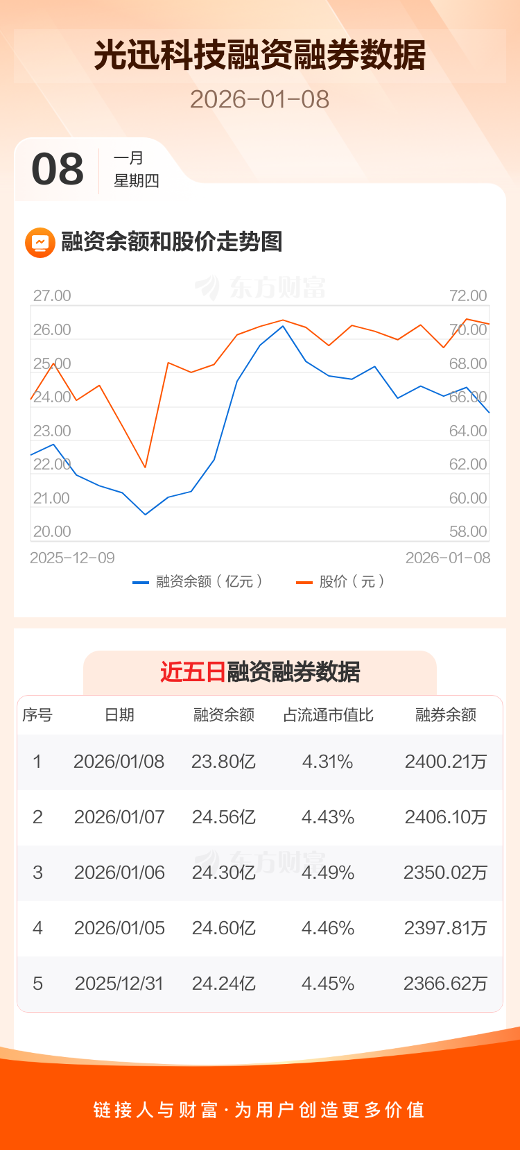 交易所最新数据显示,光迅科技于2026年1月8日获融资买入2.77亿元,融资偿还3.53亿元,当日融资净偿还7553.73万元。目前,该股融资余额23.80亿,占流通市值比例为4.31%。