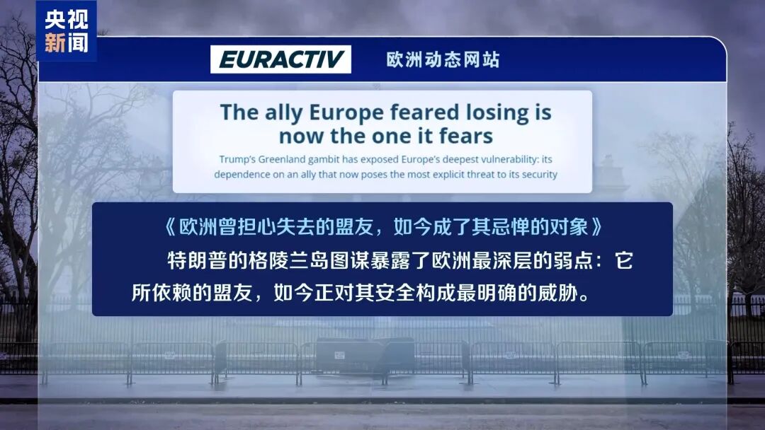 欧洲动态网站6日以《欧洲曾担心失去的盟友,如今成了其忌惮的对象》为题评论说,“特朗普的格陵兰岛图谋暴露了欧洲最深层的弱点:它所依赖的盟友,如今正对其安全构成最明确的威胁。”文章还提醒说,我们正进入一个“强权即公理”的新世界——而欧洲人对此毫无准备。或许,格陵兰岛可能带来的羞辱,将促使欧洲人反思这一现状,并最终采取行动改变局面。