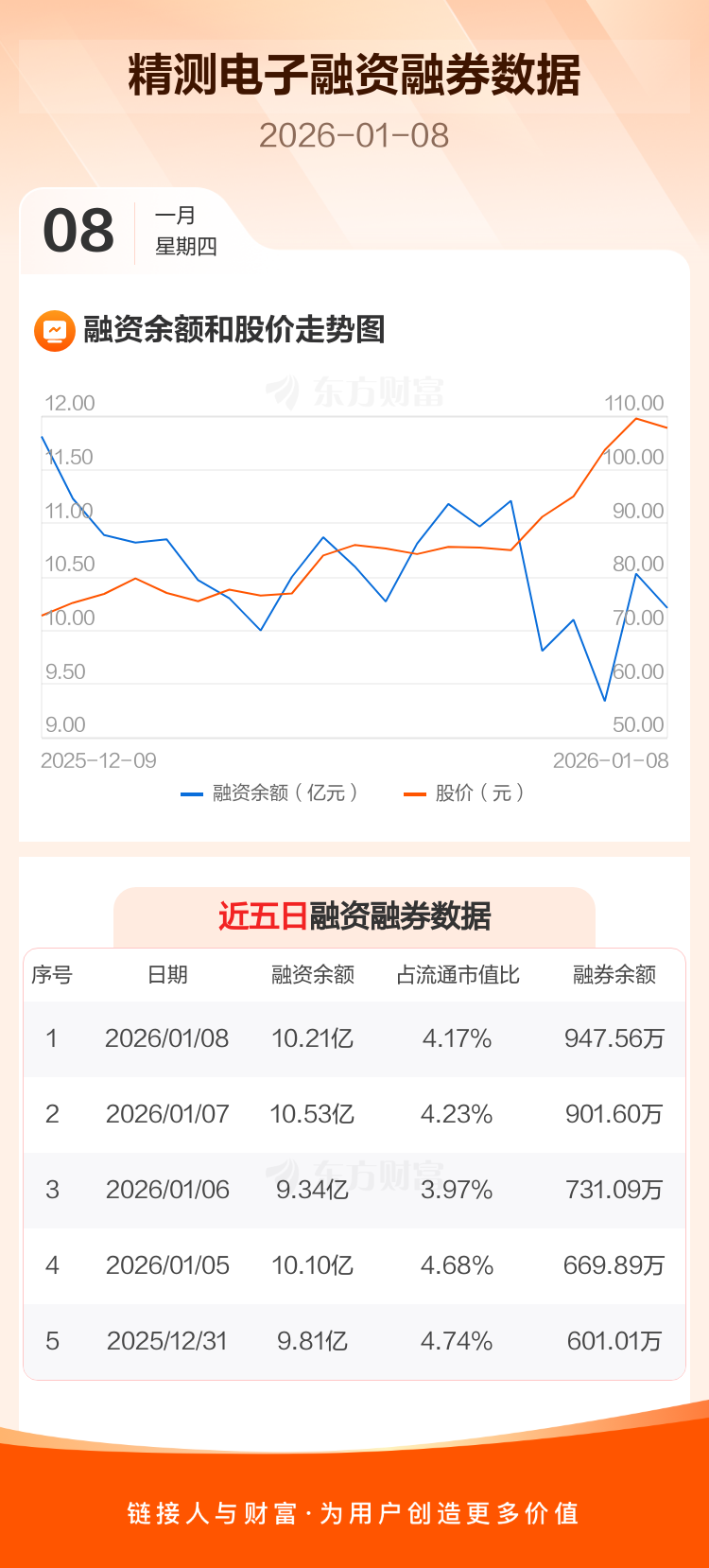 交易所最新数据显示,精测电子于2026年1月8日获融资买入1.52亿元,融资偿还1.84亿元,当日融资净偿还3237.72万元。目前,该股融资余额10.21亿,占流通市值比例为4.17%。