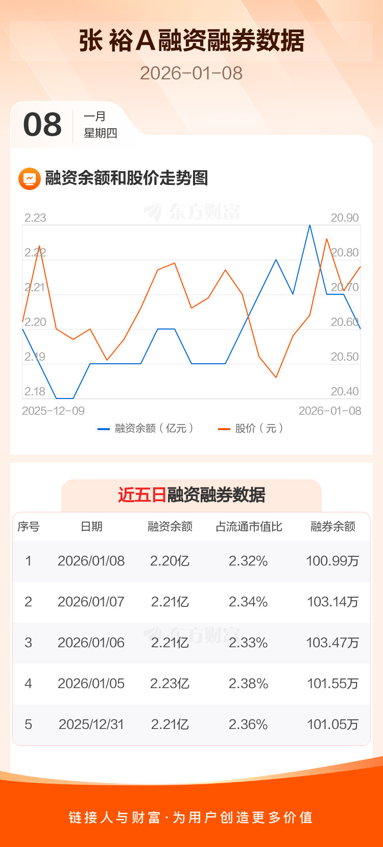 交易所最新数据显示,张 裕A于2026年1月8日获融资买入144.15万元,融资偿还240.23万元,当日融资净偿还96.09万元。目前,该股融资余额2.20亿,占流通市值比例为2.32%。