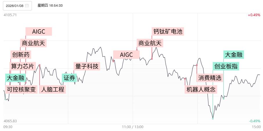 财联社1月9日电,上个交易日沪指窄幅震荡,创业板指盘中跌超1%。全市场超3700只个股上涨。沪深两市成交额2.8万亿,较前日缩量538亿,成交额连续4个交易日超2.5万亿。1)国内首个海上回收复用火箭产能基地—箭元科技中大型液体运载火箭总装总测及回收复用基地动工,此前持续火爆表现的商业航天概念再掀高潮,鲁信创投、金风科技、银河电子、邵阳液压、江顺科技实现连板晋级,泰胜风能、海兰信、航天宏图等众多低位20厘米个股封板。2)随着2026核聚变能科技与产业大会下周即将开幕,国内核聚变领域迎来催化的密集释放期,前日回暖的可控核聚变概念热度继续升温,弘讯科技、中国核建、融发核电、国机重装等多股实现连板晋级,合康新能、哈焊华通等涨超10%。3)“杭州六小龙”之一的强脑科技完成约20亿元融资,脑机接口概念走出分歧转一致走势,10厘米人气股普利特、创新医疗、岩山科技、南京熊猫实现3进4,爱朋医疗、塞力医疗强势反包走出4天3板,乐普医疗、当虹科技等多股纷纷实现反包修复。4)1月7日,工信部印发《工业互联网和人工智能融合赋能行动方案》,提出加快工业互联网与通算中心、智算中心、超算中心融合应用。国产算力产业链受此提振早盘爆发,海光信息一度涨超10%,摩尔线程、沐曦股份、寒武纪等盘中也大幅冲高。