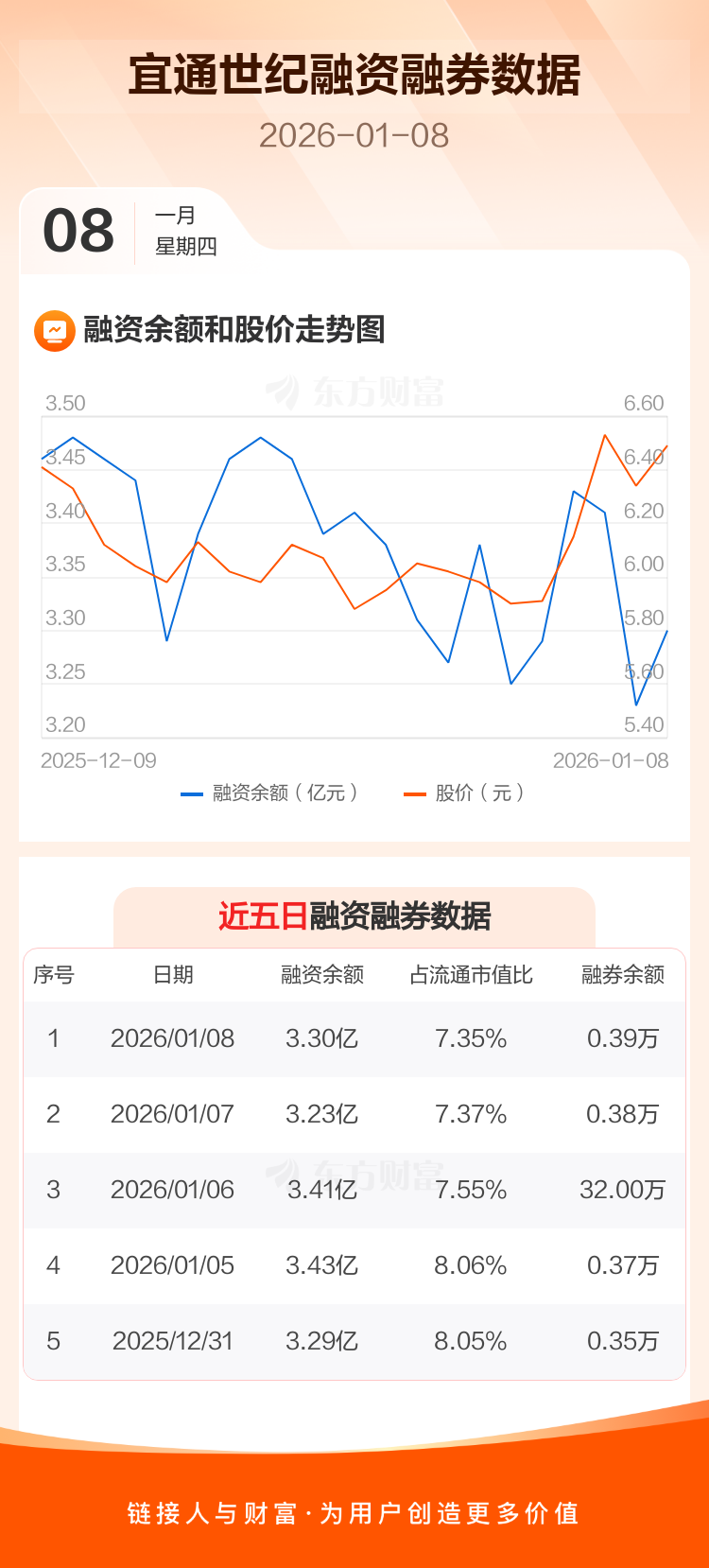 交易所最新数据显示,宜通世纪于2026年1月8日获融资买入3574.48万元,融资偿还2894.36万元,当日融资净买入680.12万元。目前,该股融资余额3.30亿,占流通市值比例为7.35%。