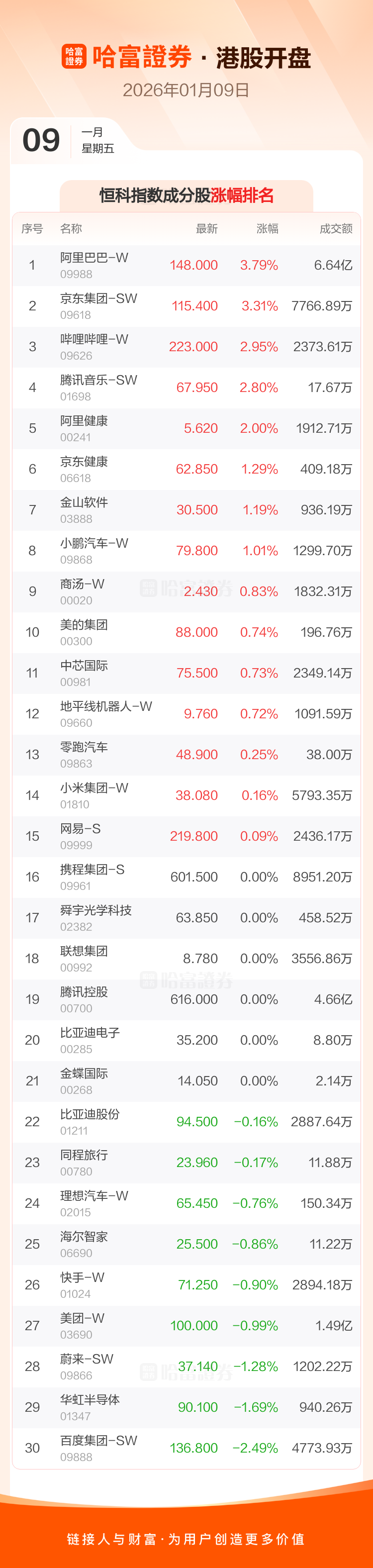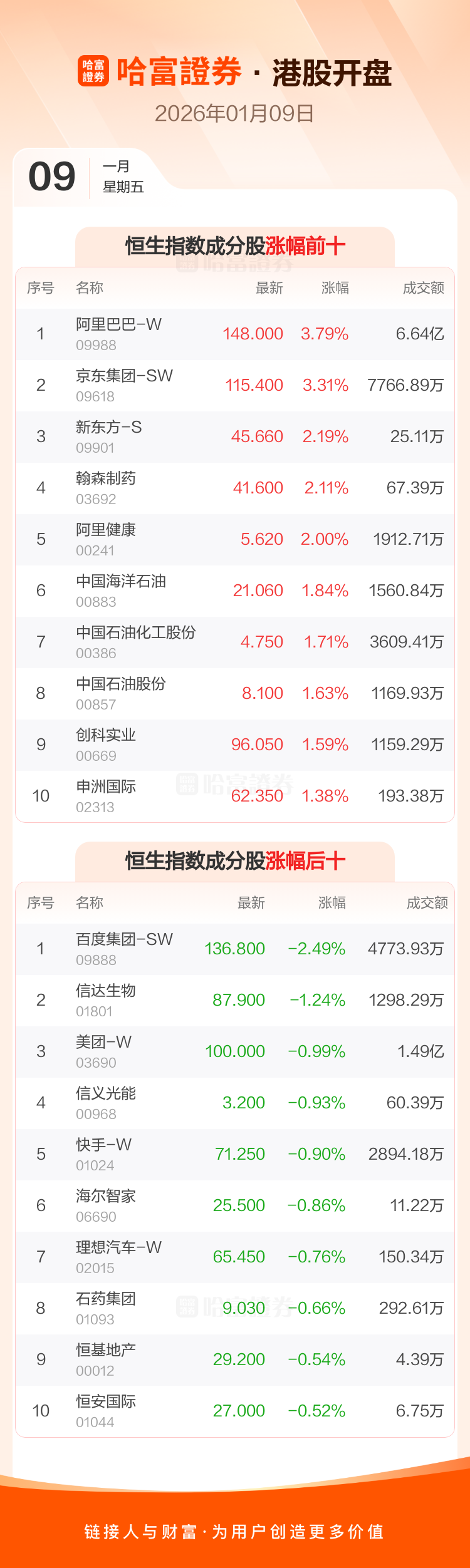 港股1月9日高开,恒生指数开盘报26272.54点,涨123.23点,涨幅0.47%;恒生科技指数开盘报5699.97点,涨21.63点,涨幅0.38%。恒生指数成分股中阿里巴巴-W、京东集团-SW、新东方-S涨幅居前,百度集团-SW、信达生物、美团-W跌幅靠前。恒生科技指数成分股中阿里巴巴-W、京东集团-SW、哔哩哔哩-W涨幅居前,百度集团-SW、华虹半导体、蔚来-SW跌幅靠前。