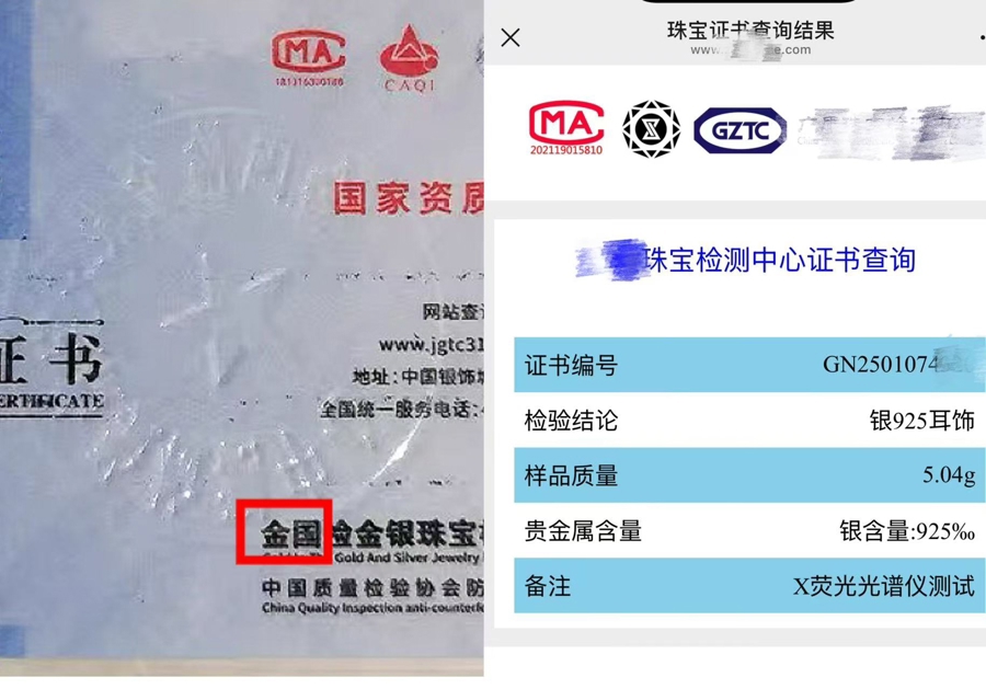 记者进一步调查发现,这类证书本身也存在较大问题。一名从事贵金属交易的电商人士告诉记者,一般权威检测证书可由国家金银制品质量监督检验中心等机构出具,是通过光谱分析等方式验证纯度,带有CMA(中国计量认证)、CNAS(中国实验室国家认可)等标志。