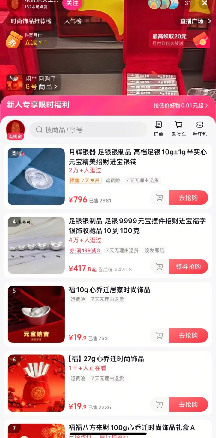 近期,贵金属行情持续走高,白银、黄金等产品价格不断刷新高位。与此同时,在短视频平台的直播间里,“白菜价”的“足银9999”“四个九纯银”“假一赔十”的银条、元宝却频频出现,吸引大量消费者下单。