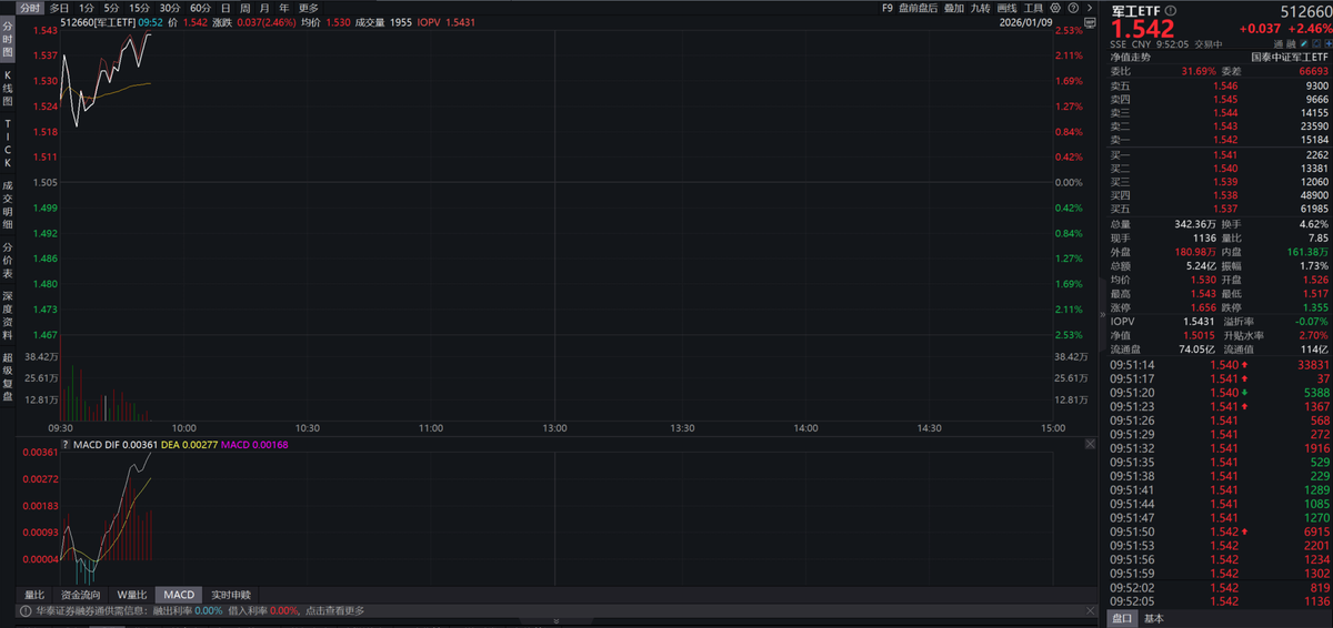 商业航天产业快速崛起,成为航天强国战略的重要组成部分。军工行业基本面再受提振,市场认可军工板块高景气,军工ETF(512660)涨超2.4%。