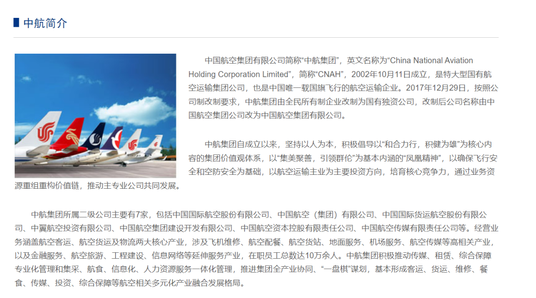 公司官网显示,中航集团于2002年10月11日成立,是特大型国有航空运输集团公司,也是中国唯一载国旗飞行的航空运输企业。2017年12月29日,按照公司制改制要求,中航集团由全民所有制企业改制为国有独资公司,改制后公司名称由中国航空集团公司改为中国航空集团有限公司。